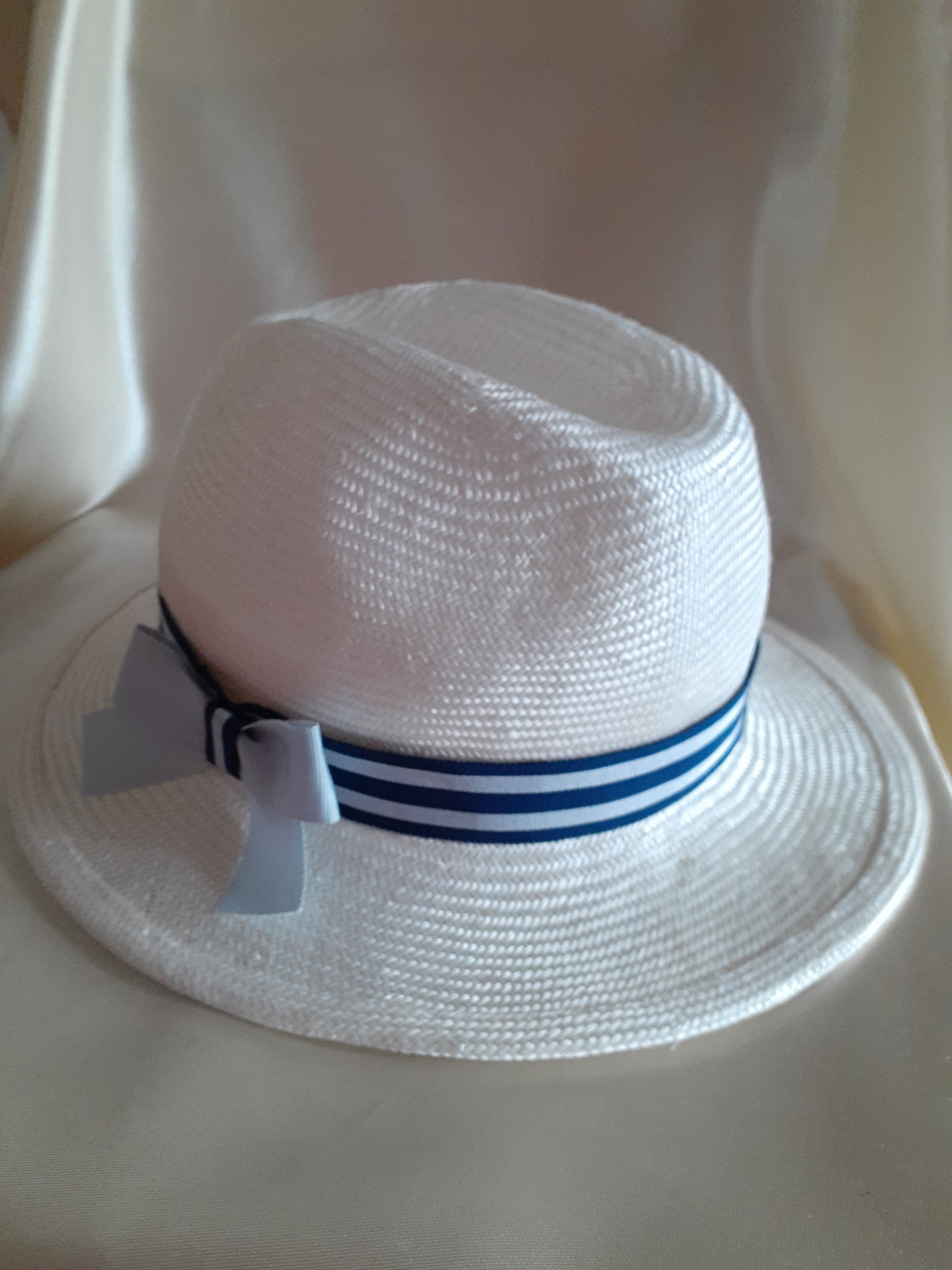 White parisisal straw fedora with a navy blue and white/grey striped petersham headband and finished with an ice blue/grey petersham bow. Head size 57.5cm, height of crown 12.5cm, circumference 92cm.